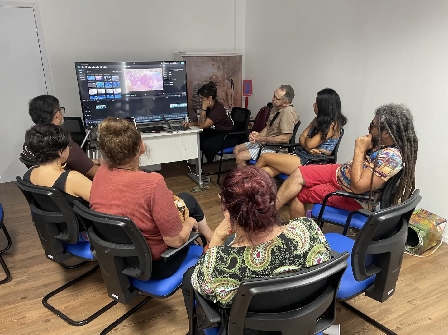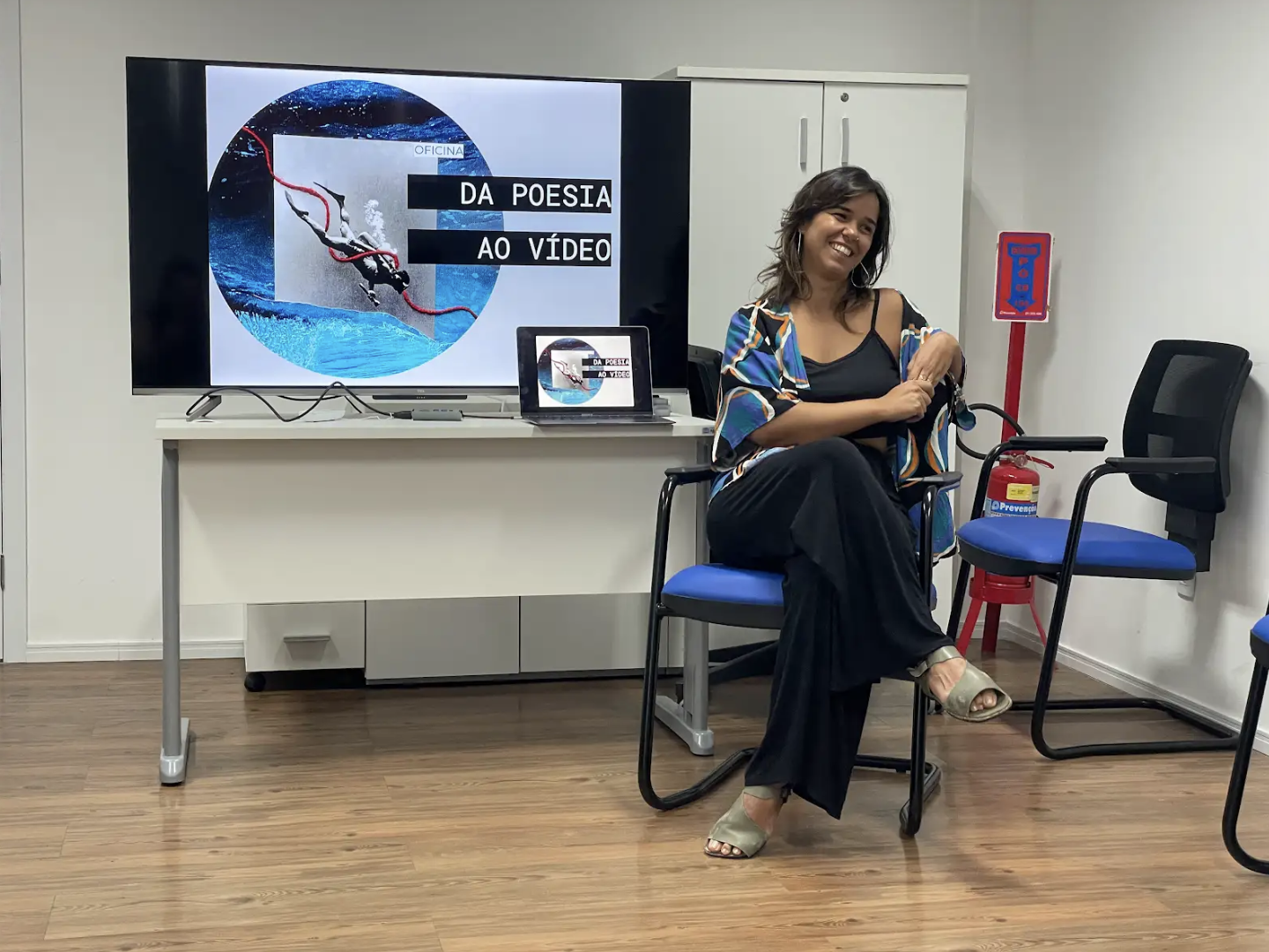 A oficina foi conduzida por Eva Jofilsan, que compartilhou sua experiência no audiovisual, propondo uma imersão criativa no encontro entre palavra e imagem.