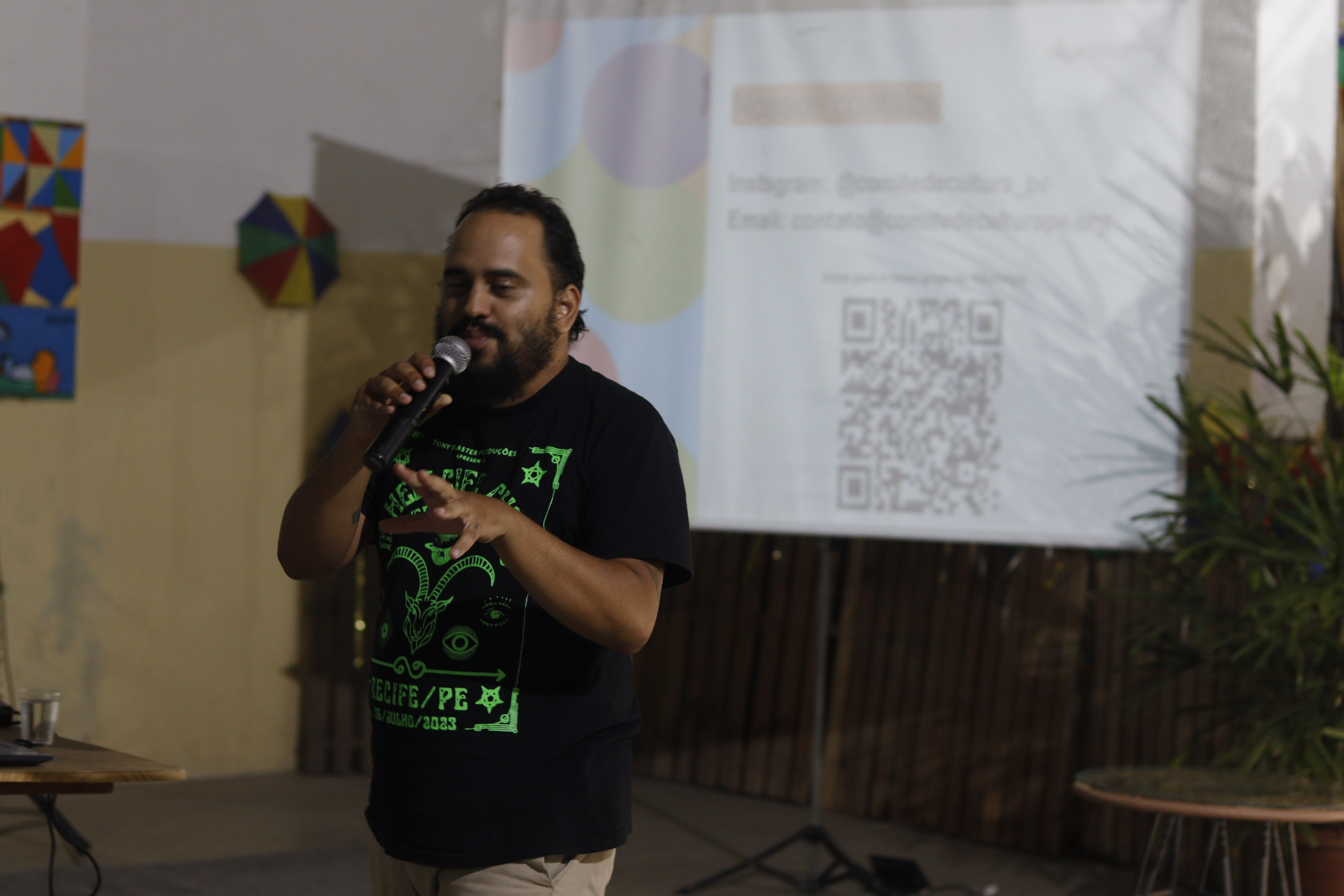 A programação teve início às 19h30 com uma apresentação cultural de dança e música percussiva (maracatu de baque virado), recepcionando os participantes na entrada. Artesãs e artesãos locais também organizaram uma mostra de produtos artesanais, valorizando a produção local.