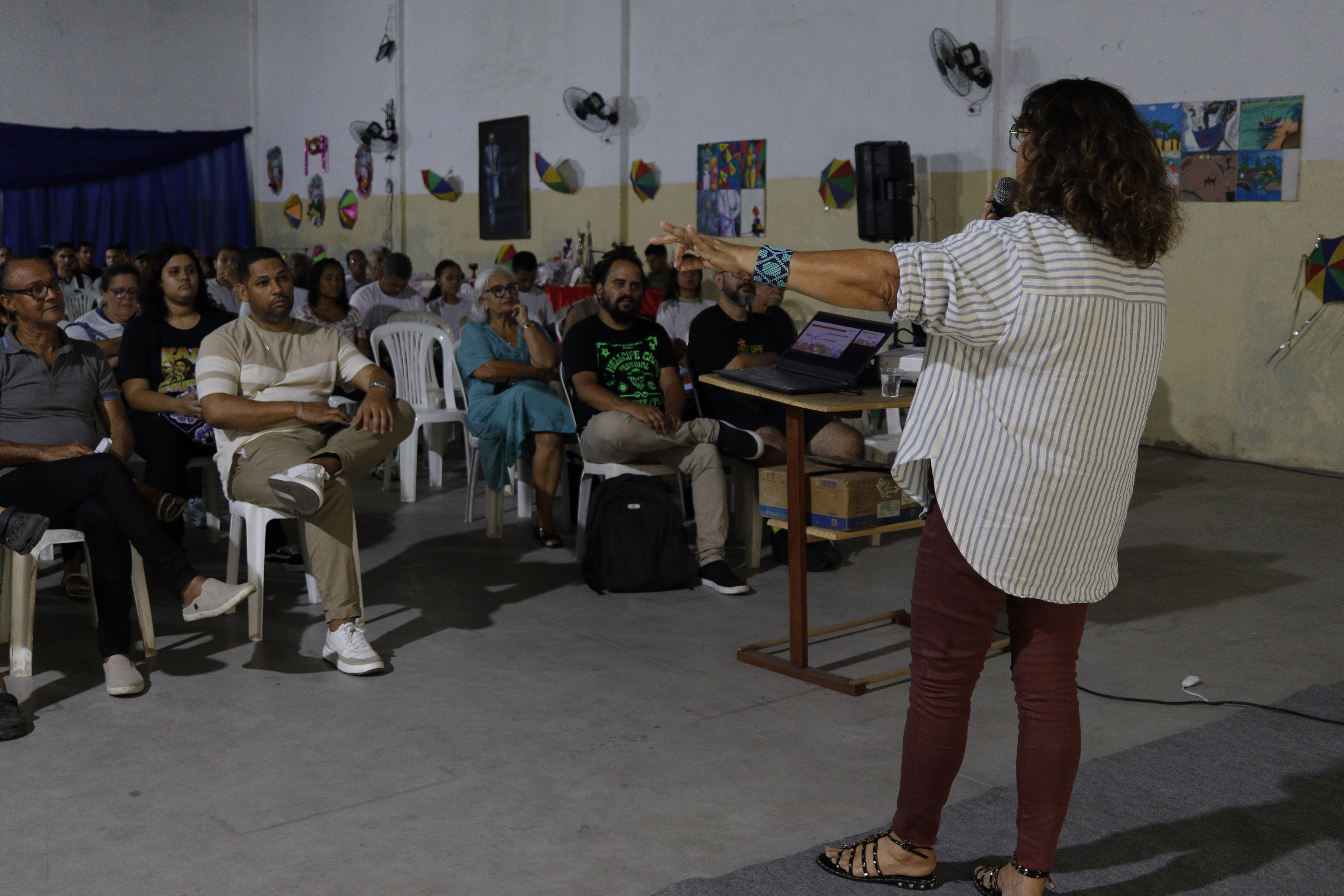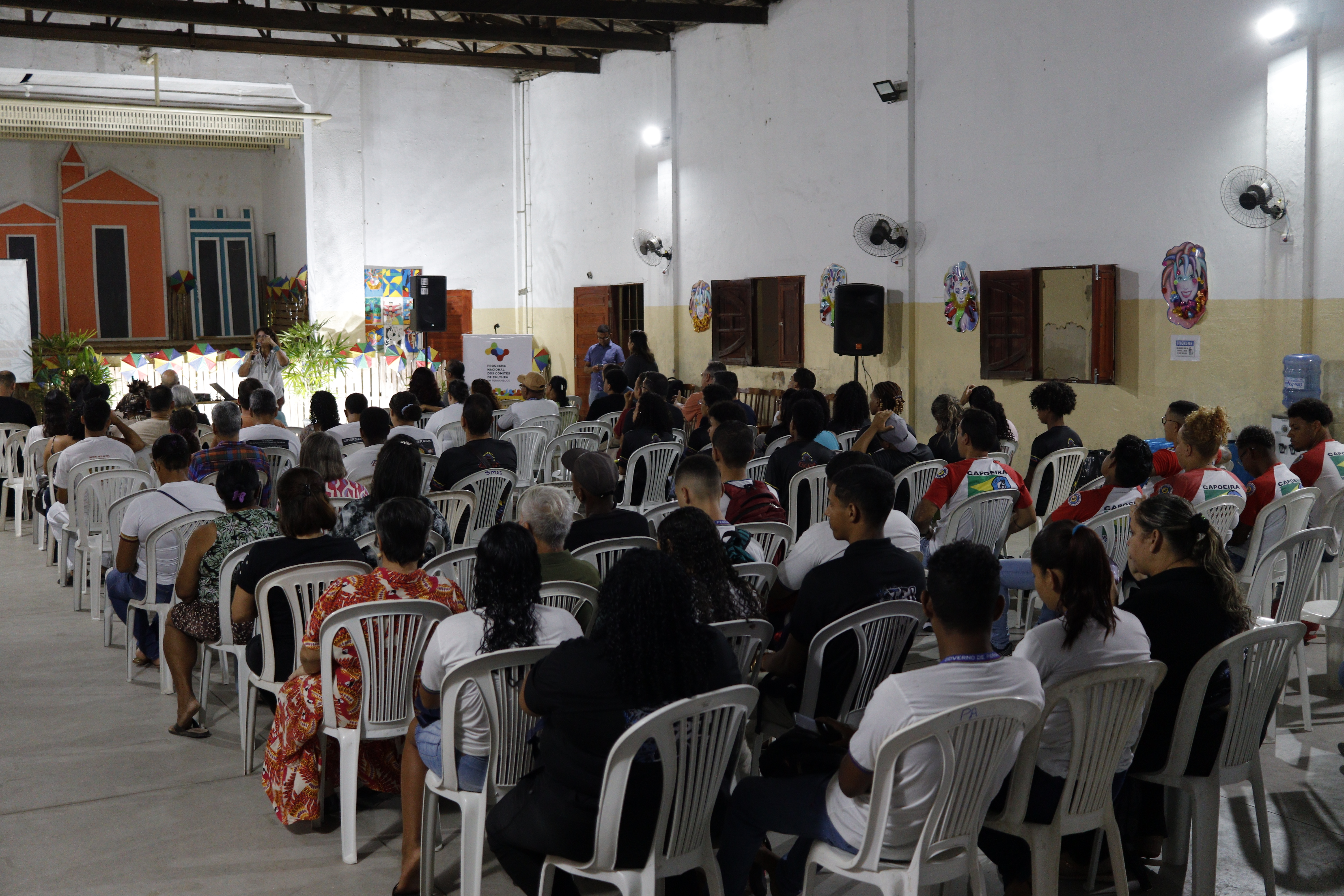 A programação teve início às 19h30 com uma apresentação cultural de dança e música percussiva (maracatu de baque virado), recepcionando os participantes na entrada. Artesãs e artesãos locais também organizaram uma mostra de produtos artesanais, valorizando a produção local.