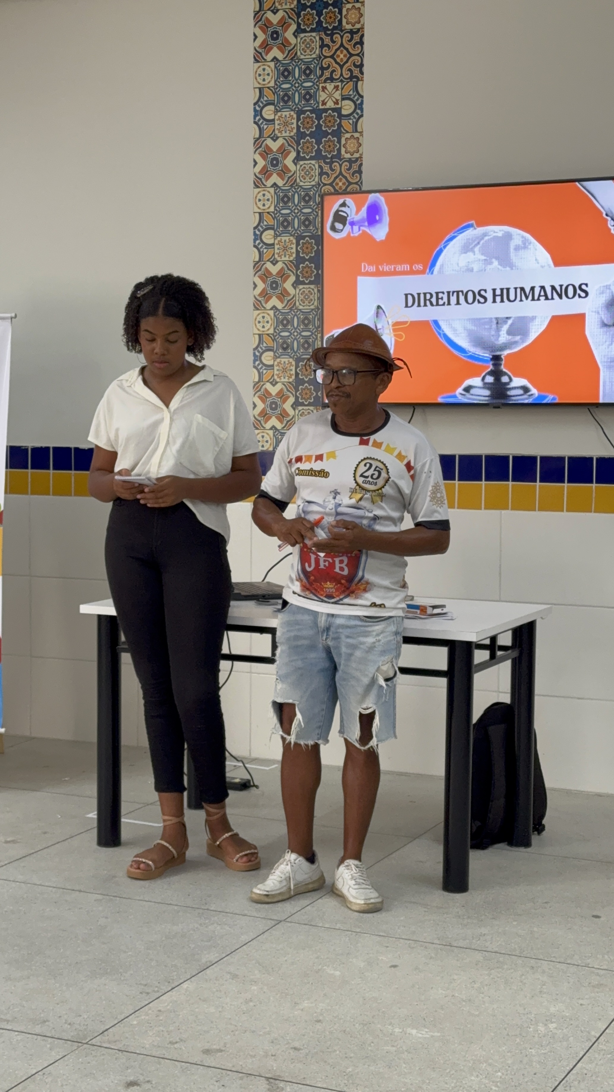 A palestra principal, “Por uma Cultura de Direitos”, foi conduzida por Jéfte Amorim (jornalista, mestre em Extensão Rural e Desenvolvimento Local, doutorando em Educação Matemática e Tecnológica e ativista de Direitos Humanos). Ele estimulou dinâmicas interativas e reflexões acessíveis, mesmo para participantes sem letramento, promovendo um ambiente inclusivo.